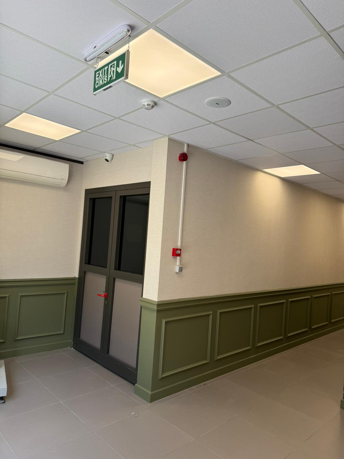 Yangın risklerine karşı erken müdahale sağlamak adına Eleks marka yangın algılama sistemi titizlikle projelendirilmiş ve uygulanmıştır. Ayrıca personel yönlendirme ve acil durum tahliyelerini kolaylaştırmak için acil aydınlatma ve exit yön tabela sistemleri aktif hale getirilmiştir.